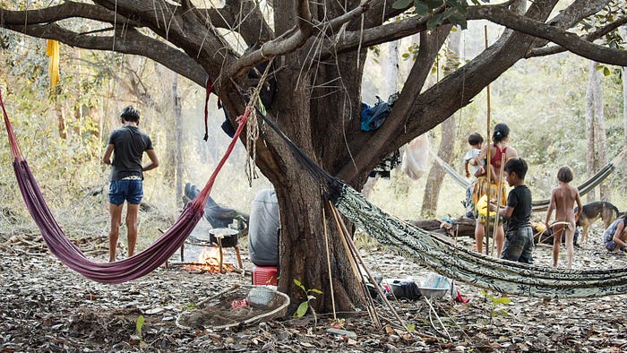 It’s a fishing day — timbó day. On a lake in the middle of the Xingu river, the Ikpeng beat the water with timbó, a grass that poisons the fish but that doesn’t harm humans. Around the edge of the lake families camp in their hammocks and prepare fires.
